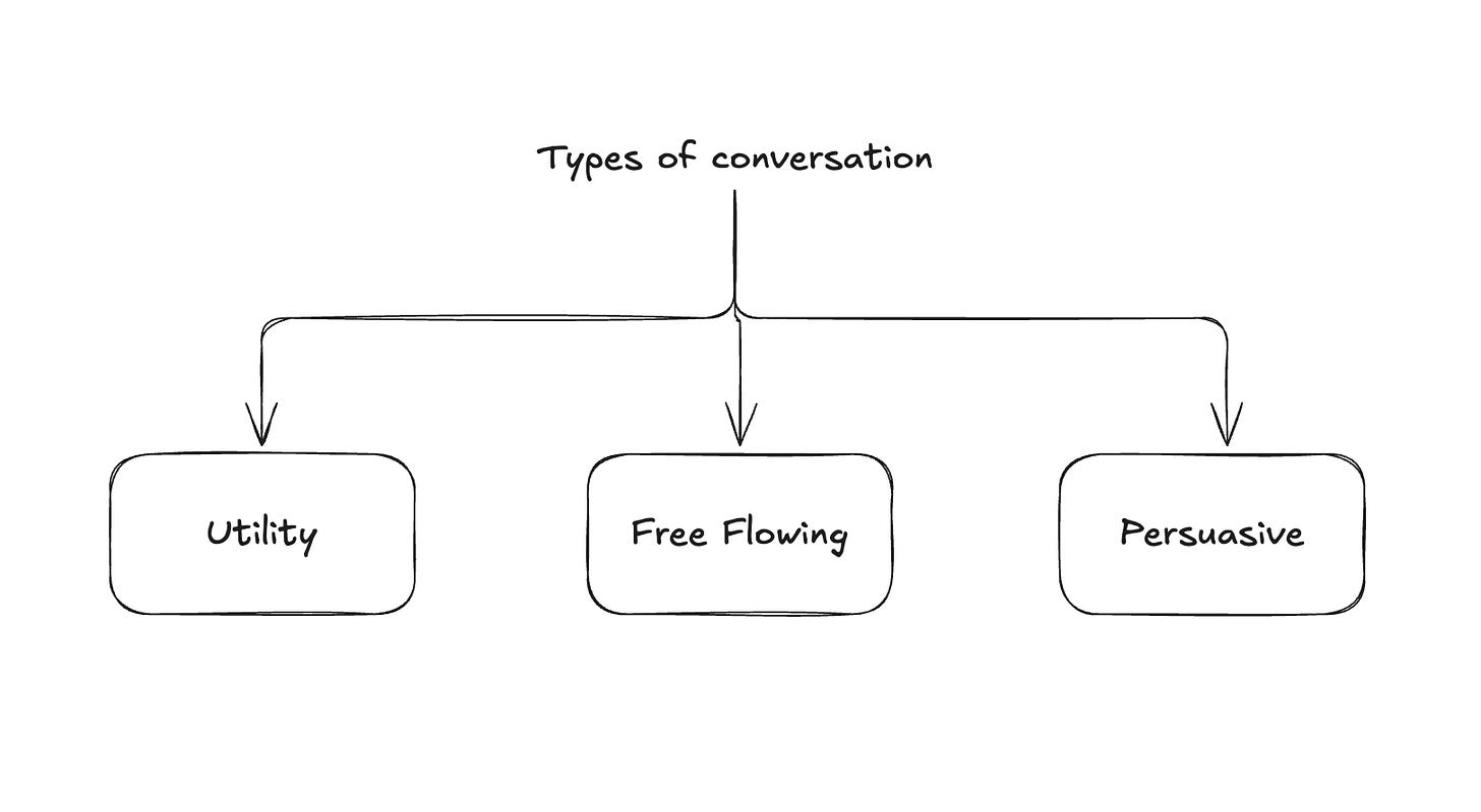 Persuasive Conversations: This sits in the profitable middle ground between Utility and Free Flowing. This is where the real money lives - every conversation that requires changing minds rather than simply providing information. Loan collections, insurance sales, complex purchases, understanding why someone abandoned their shopping cart. They require something more sophisticated: the ability to build just enough trust to accomplish a specific goal, then gracefully exit.