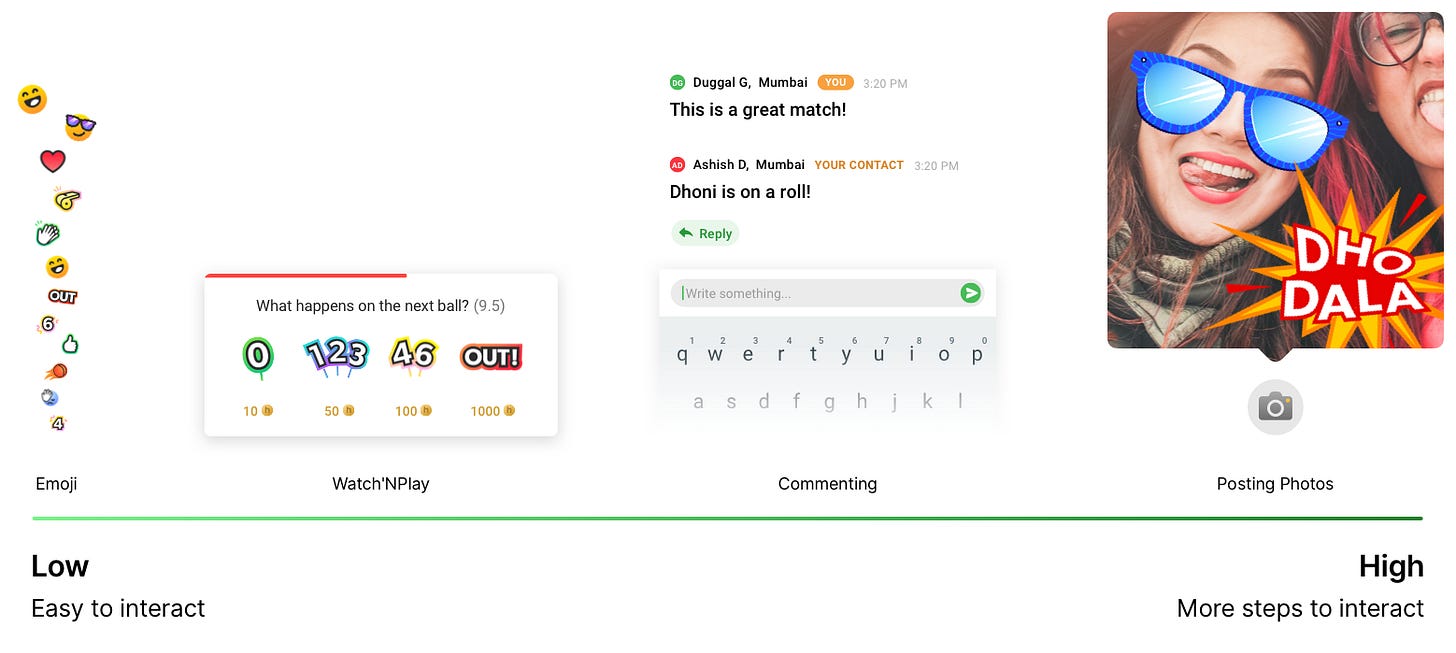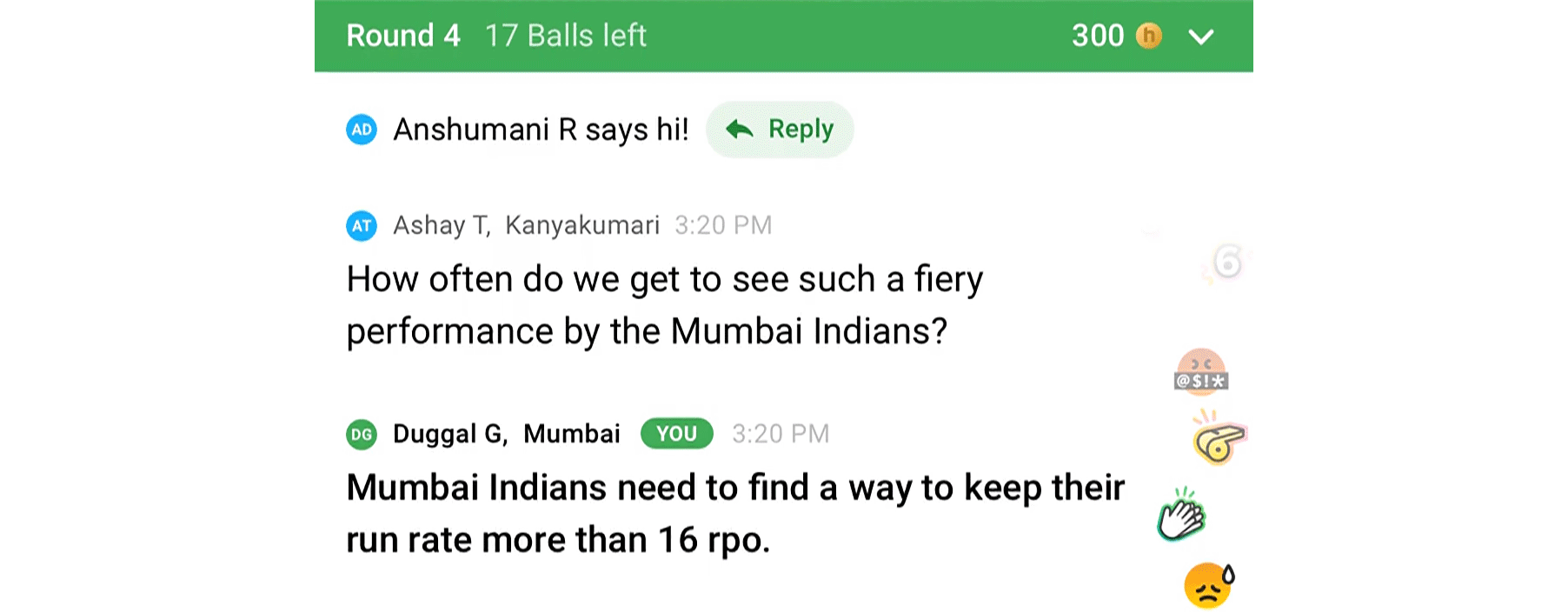 This is when we turned it into a social feed with emojis and the ability to chat with friends. Our whole thing was, when people skip out of the Hotstar app, they go to Twitter or Facebook to talk about the game. Why is this conversation happening on Twitter when it should be happening on Hotstar?.